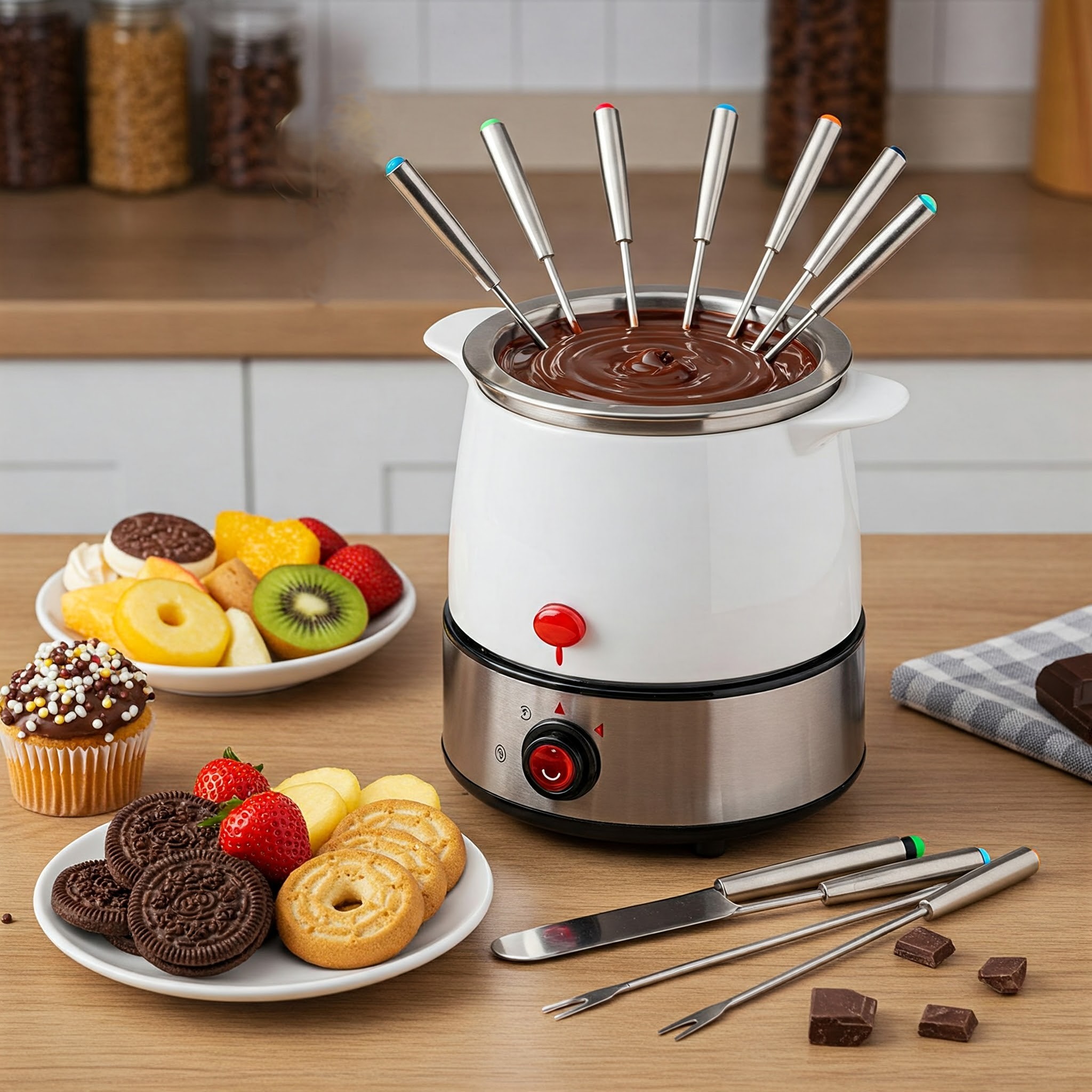 Una fondue de chocolate que incluiría accesorios (espátula, diez tenedores y diez pinchos) cuyo servicio está pensado para disfrutar del placer de un exquisito chocolate fundido sólo o en compañía de familiares y amigos en fiestas, ocasiones especiales o en cualquier momento que apetezca. Una forma cómoda y sencilla de degustar sin salir de casa todo tipo de frutas, galletas o dulces sumergidos en delicioso chocolate caliente fundido. Además, es de gran utilidad para preparar apetecibles postres o para decorar con chocolate magdalenas, gofres, rosquillas, pasteles, tartas, etc. Se recomienda utilizar chocolates especiales para fundir. Se puede usar también para derretir caramelo.
