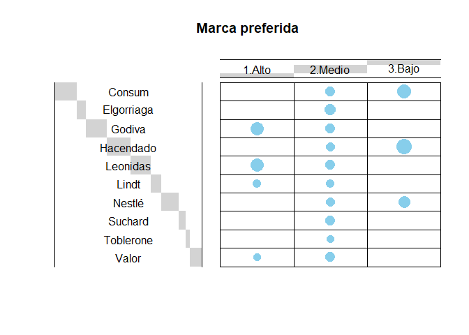 Para analizar las relaciones entre las marcas, usamos un análisis de correspondencias. Tras varias relaciones con otros datos de clasificación, pruebas en las que no había nada significativo, hemos visto que se produce una asociación clara entre las marcas de lujo que son más recordadas o elegidas como preferida por los hogares con ingresos altos.