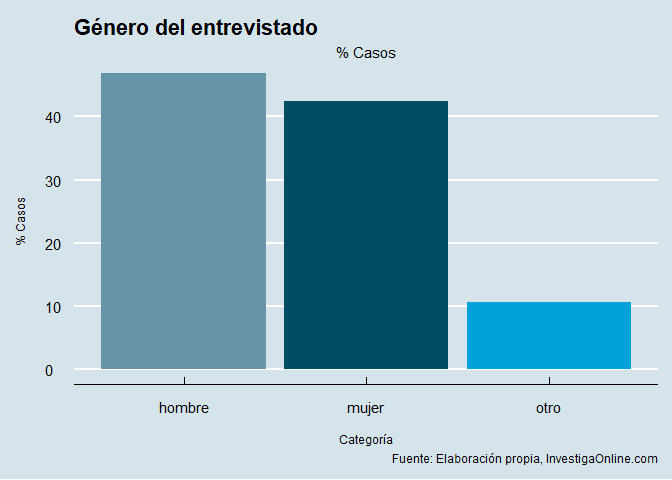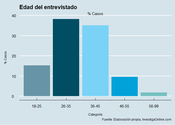La edad muestra claramente un sesgo poblacional hacia las personas jóvenes, no buscado, pero evidente. Probablemente haría falta si la edad fuera un factor dominante el establecer alguna ponderación en la muestra para corregir esta situación. Algo que no consideramos necesario por el carácter exploratorio y no probabilístico del muestreo.