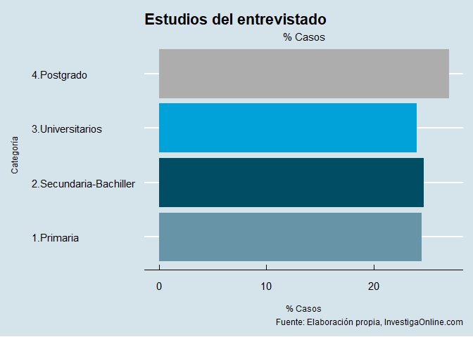 Resultado muy atípico y equilibrado en el nivel de estudios. Alto porcentaje de postgrados y universitarios respecto a enseñanza secundaria y primaria Ver INE, 2023[]. Esto es muy característico del sesgo que se introduce por el uso de una muestra de clientes del producto que desvía esos datos.