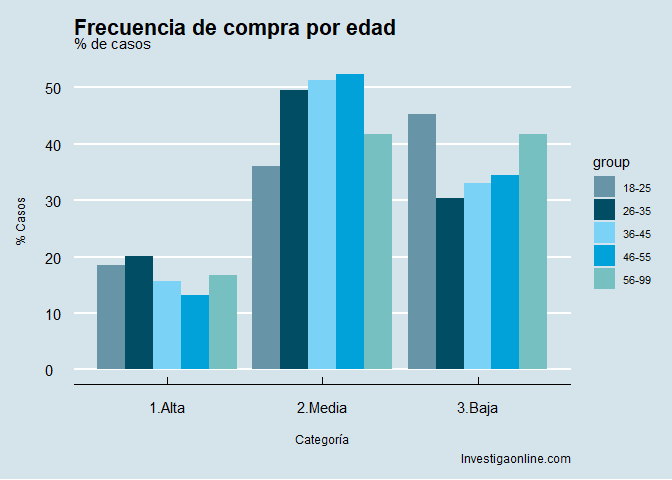Si analizamos los datos por edad, vemos que los tramos de edad media, tienen una frecuencia de compra media más alta, mientras que los jóvenes presentan menores valores de frecuencia de compra que el resto de tramos de edad, como puede verse en la siguiente tabla.