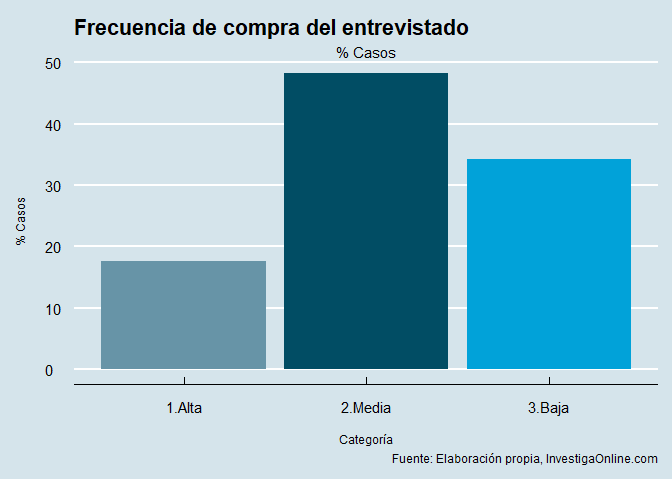 Pasamos ahora a hacer una descripción de la frecuencia de compra, así como de los hábitos de consumo de chocolate. Curiosamente, el chocolate no es claramente un artículo de primera necesidad, pero es consumido por una gran parte de los hogares.