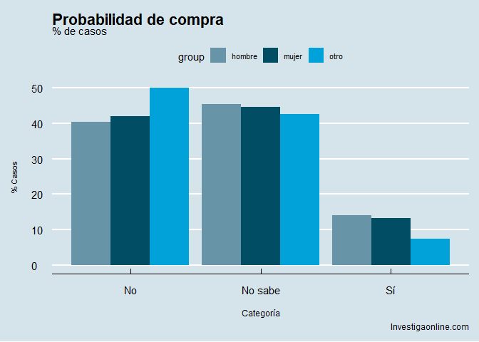 Si distribuimos esa frecuencia por hombres y mujeres, vemos que en la mayor parte de los casos, no existen diferencias (lógico) aunque sí hay una pequeña diferencia entre lo declarado por los hombres y las mujeres. Nótese que la compra no es individual, sino que es en el hogar.