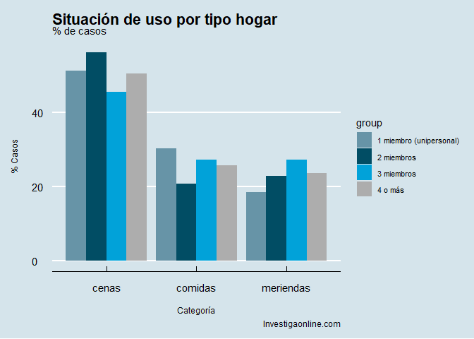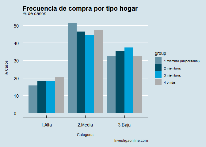 Si distribuimos esa frecuencia por tipo de hogar, no se aprecia ninguna diferencia significativa. Nótese que la compra no es individual, sino que es en el hogar, salvo en los unipersonales, obvio.